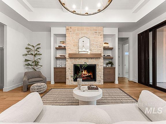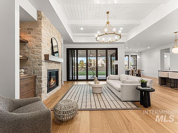 Welcome to this exceptional single-level home by Iron Oak Homes! This thoughtfully crafted residence showcases a spacious open floorplan with soaring ceilings, elegant neutral finishes, and designer lighting throughout. The expansive great room is anchored by a floor-to-ceiling stacked stone fireplace and walls of Andersen Telescopic doors that seamlessly extend the living space to the covered patio. The kitchen features a large entertaining island, two-toned ceiling-height cabinetry, sleek quartz countertops, and premium SS appliances.The luxe master offers direct patio access, a spa-like en suite with a frameless glass walk-in shower, freestanding soaker tub, and a show-stopping walk-in closet. Fourth bedroom can easily function as an office, bonus room, or guest retreat. The home also includes a 2-car garage plus an oversized boat bay with 11’ ceilings—perfect for storing recreational gear. Enjoy all the amenities Centerra has to offer including a community pool & walking paths, minutes from downtown Eagle