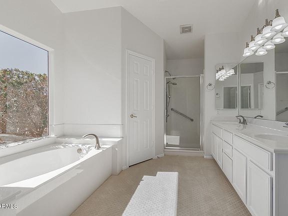 Discover your oasis in Chandler! This stunning home features an open living space with both formal living room and family room with a cozy fireplace. Vaulted ceilings, tons of natural light, and neutral paint enhance the airy ambiance. The large primary bedroom includes french doors, a bay window, and large ensuite bath with dual walk-in closets, skylight, dual sinks, and large picture window. Spacious guest rooms, additional hall closet, RV gate, and built-in shelving in the 3-car garage offer plenty of storage options. Outside you'll find mature desert landscaping, an extended covered patio, and easy-to-maintain turf. Recent updates include updated paint, newer HVAC (2020), and newer water heater (2024). (more) This home is conveniently located near multiple groceries and shopping and dining areas while also being near the AZ-60, AZ-101, and AZ-202 for easy commuting. Come see it today!