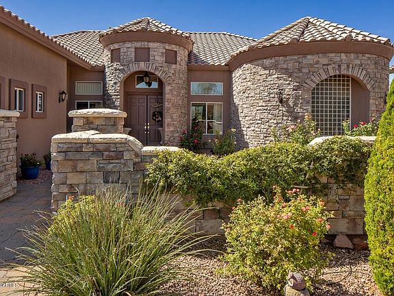 3BR, 4BA, plus den/exercise room & office, 2808 SF home on rare .36 ac. lot with panoramic mountain views is waiting for you. From the grand entry to the elegant Great Room, upgraded kitchen, formal dining room, glass enclosed office, den, laundry w/cabinetry & spacious 2+ car garage, this home exemplifies the success & comfort you deserve. Paver exterior courtyard, circular drive w/lion statues & covered patio area for entertainment, low maintenance landscaping contribute to the lifestyle you want to share w/friends & family. Clubhouse, pool are within close proximity to home; golf is nearby as well. Spacious backyard allows for your own personal taste & development. Master Suite is spacious, ensuite bath is 17x17' w/freestanding tub, double walk in elegant shower & more. See list.