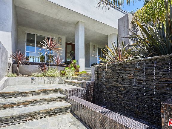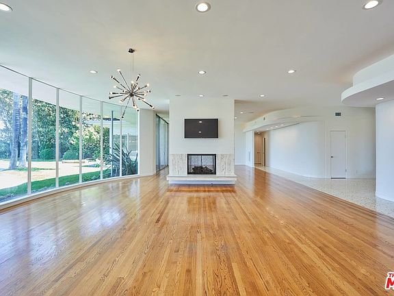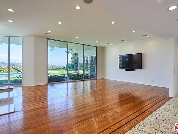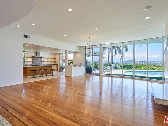Luxury awaits at this sumptuous Mid-Century modern with panoramic views of Westside and Downtown. Single level entertainer's dream affords ample public and private spaces. Hardwood floors are sustainable and non-toxic/Green. Solar panels for pool & home with credits for excess power produced. 9 Stage FDA Compliant water filtration. Terrazzo walkway leads to dramatic entry with huge living and dining areas separated by double-sided fireplace. Chef's kitchen with generous counter space. Seamless flow from indoors to outdoor patio, pool and lawn. Four bedrooms complemented with 4.5 bathrooms. Master suite looks out to pool and meticulously landscaped grounds with en-suite bathroom and walk-in closet. Two more large bedrooms just down the hall. One bedroom has en-suite bathroom, and both have access to another bathroom in adjacent hall. Fourth bedroom is near kitchen and can be also be used as an office/den, with its own adjacent bathroom. Property is gated. 2 car garage w/ direct access. Warner/Roscomare Elementary per LAUSD Resident School Identifier.
