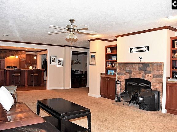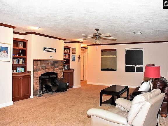 • Living Room: Fireplace, Molding, Books, Ceiling Fan