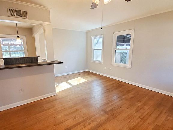 Charming 2BR/1BA home in Colonial Acres. New deck porch. 1-car carport. Hardwood floors throughout open floor plan. Family-sized living room opens to dining room, kitchen, & separate breakfast area. Kitchen is equipped w/range/oven, disposal and dishwasher. Laundry RM w/storage cabinets off kitchen. 2 bedrooms w/large closets shared full bath w/tile floor. Large covered patio overlooks huge fenced backyard w/2 storage bldgs & mature trees for shade. Can be 3BR. OPEN HOUSE Sat 1/16 12p-3p.