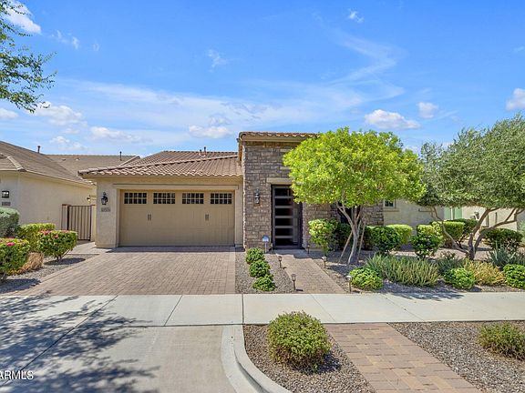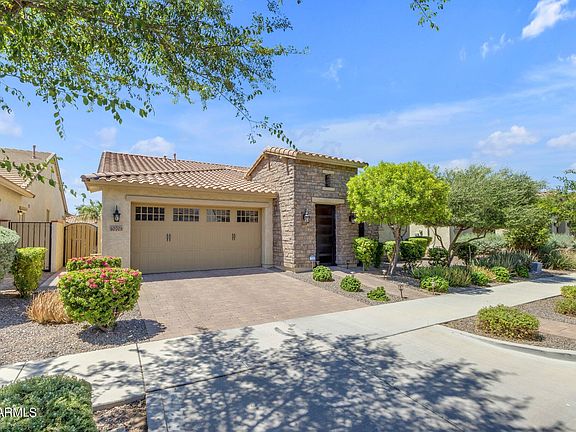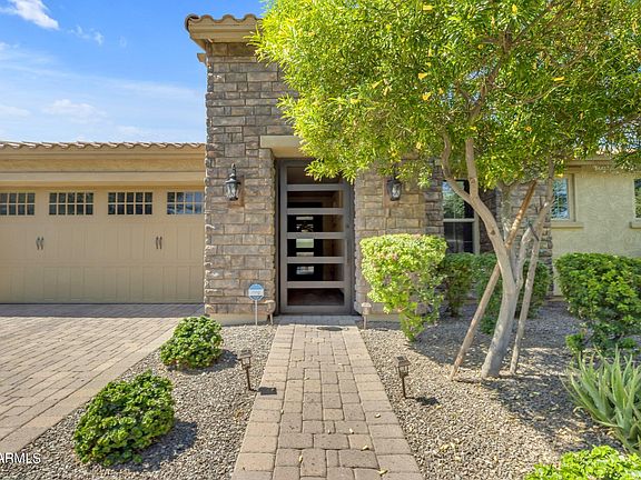 Absolutely stunning single-level (3 Bed/2.5 Bath +2 Bonus Rooms) home in the Highly desirable Eastmark Community! The home wows right when you pull up with the curb appeal that includes a private entryway with custom iron gate, stone trim, and designer garage door. Enter the home and you will notice high ceilings, large tile flooring, and open split floor plan. The Great Room is designed for entertaining with plenty of space, a huge kitchen island, multiple glass sliders for easy access to the large backyard, and dining area. The backyard is low maintenance with artificial grass and also has a nice sized covered patio. The Master Suite features a dream sized walk-in shower and walk-in closet. The other bedrooms are also great with walk-in closets. Don't forget the community center & Pool!
