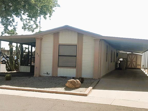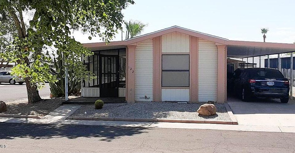 Nice 2 bedroom, 2 bath split floor plan, vaulted ceiling, large inside laundry. All appliances convey including washer/dryer/refrigerator. Ground set home with screened in patio, Tuff storage shed, 2 car carport. Situated on corner lot across the street from the community recreation center. Apollo Village is a 55+ age restricted community on leased land. Base lot rent is $848/month. All owner-residents must apply for park approval. Enjoy the community weekly social activities/events, bingo, heated pool/spa, fitness room, clubhouse lounge/billiards, library, car wash, dog park. Great location near a variety of shopping/restaurants/hospitals/clinics/casino/sports venues & easy access to Hwy Loop 101. Home only financing may be available to qualified buyer's. Great Location inside park