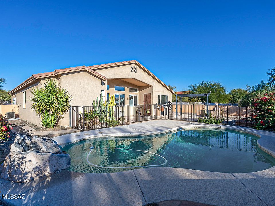 Ask about the 2.75% Assumable Loan. Desirable Suburban Eastside semi-custom home in the Gated Community of Rancho Cancion West. Located on an oversized lot in a Cul-de-sac with a southwest facing backyard. The outdoor area boasts an inviting Pool w/solar assist heating, Outdoor Kitchen, Chimenea Fireplace and flagstone patio - Great for entertaining and creating memories. Enter this bright beautiful home filled with natural light that has 4-bedrooms, 2 baths and a 3-car garage. 4th bedroom could be used as office. Kitchen has Corian countertops and recently upgraded stainless-steel appliances, walk in pantry. Leased Solar. New 2022 air conditioning unit and hot water heater. Livingroom windows have newly installed remote controlled window shades. This home is a must see! Don't miss this opportunity to make this your home!