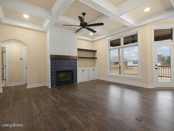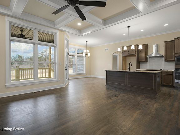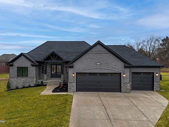 Welcome to the exquisite 10702 Gordon Farm Trace in Louisville, KY. This stunning residence nestled within the charming Farms of Lovers Lane community offers an impressive floor plan on a generous lot. As you approach this home, you are greeted by an inviting foyer featuring glass paned double doors that open to a spacious and bright floor plan. The great room is a focal point with its coffered ceiling and gas fireplace adorned with blue tile surround and a wood mantel. A built-in bookcase provides ample space for displaying your favorite books or collectibles. The heart of this home is undoubtedly the kitchen, equipped with GE stainless steel appliances, including a flat cooktop, built-in microwave, and wall oven. Custom cabinets provide plenty of storage while granite countertops and a large farmer sink add touches of luxury. Adjacent to the kitchen is an eat-in dining area perfect for casual meals or entertaining guests. The primary suite boasts a vaulted ceiling and an ensuite accessed through a sliding barn door. Here you will find dual vanity sinks, walk-in shower, soaking tub, and a large walk-in closet that conveniently connects to the laundry room.