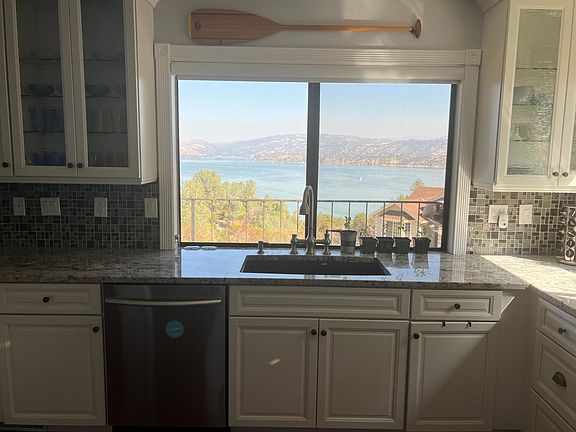 Newly remodeled! Gorgeous hardwood floors! No carpets! All appliances stay. Incredible views from the entire back of the house. Look at the lake while you enjoy a cool or warm beverage on the back deck or back patio! Cozy up to the gas fire during the winter. Central heat. And central air conditioning!! All appliances! Gorgeous white kitchen with white granite countertops. Both upstairs bathrooms have their own gorgeous bathroom. Downstairs back bedroom has sliding glass doors out to the huge cement patio. Very private! Watch the sunrise or set over the lake with your 180 degree views! Front downstairs bedroom has large walk in closet. If you only need three bedrooms, use the downstairs as a bonus family room! Or office!
