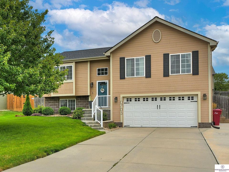 Showings start Friday, 8/26 at 10 am. It's what you have been dreaming of...meticulously maintained with updates in all the right places. The kitchen boasts newly painted cabinets, quartz countertops, island, backsplash, Blanco sink, above/below cabinet lighting, and new light fixtures. A beautifully updated fireplace with stone, shiplap, and new mantel which adds character to the living room along with vaulted ceilings. Hall bathroom has quartz countertops with raised, white cabinets. Primary bathroom has quartz countertops, white cabinets, and tile flooring. Extra deep 2 car garage with a 3rd car parking pad. The fun is right in your own backyard with an above ground pool, spacious deck, and pergola for family fun and/or entertaining. Easy access to highway 370, Offutt AFB, movie theatre, shopping, and restaurants. New roof (2021), New dishwasher (2021), New Interior paint upper level (2022), and New pool pump (2020). Tons of updates, you don't want to miss this one!