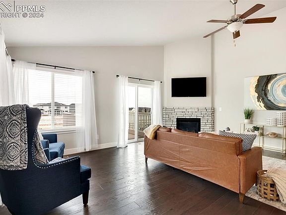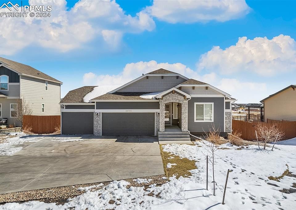 Welcome home to this stunning 5-bedroom, 3-bathroom ranch-style residence nestled in the highly sought-after Meridian Ranch neighborhood. Boasting a rare combination of features, this home offers an expansive layout with a 3-car garage, oversized driveway, and sits on a spacious lot of nearly 15,000 square feet, backing onto a serene greenbelt, all within a quiet cul-de-sac setting. Step inside to discover a bright and airy open floor plan complemented by modern finishes, including quartz countertops and soft-close cabinets, creating an inviting atmosphere for daily living and entertaining alike. The upstairs living area includes a cozy gas fireplace, perfect for curling up on those snowy Colorado days. The master suite is a true retreat, boasting a luxurious deep soaking tub, ideal for unwinding after a long day, and a spacious walk-in closet. Downstairs, the generously sized finished basement adds to the allure of this home, featuring a large wet bar area with a wine rack and ample cabinet space, offering the perfect setting for hosting gatherings or relaxing with loved ones. Designed for comfort and convenience, this home is equipped with practical amenities such as a whole-home humidifier for Colorado's dry climate, an automatic sprinkler system, and air conditioning. Plus, the property comes complete with a full-home solar panel system that will be fully paid off at closing, offering both sustainability and cost savings. As a resident of Meridian Ranch, you'll enjoy access to a wealth of community amenities, including a 42,000 square foot recreation center with a gym, indoor basketball courts, indoor/outdoor pools, a spa, free fitness classes, and a childcare center. Outside, discover miles of scenic walking trails, playgrounds, a dog park, dining options, and Colorado's longest golf course, all within reach. Conveniently located near military bases, this home offers easy access to shopping, dining, and entertainment, making it the perfect place to call home!