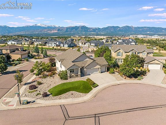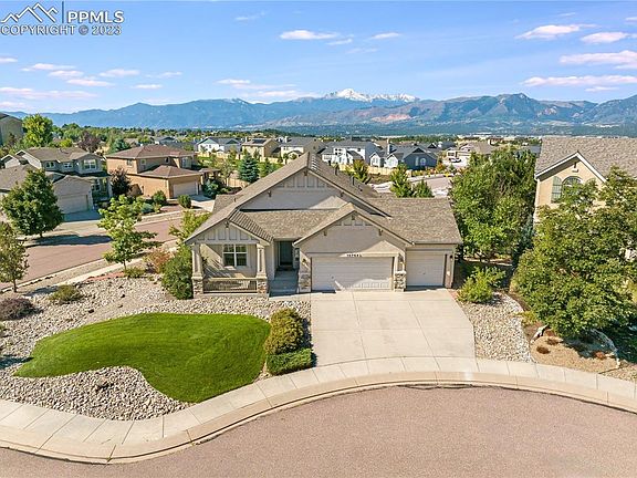 This beautiful Keller home boasts a breathtaking view of Pikes Peak! Situated on a large lot in a quiet cul-de sac, this ranch home offers an open floor concept with hardwood floors and extraordinary high ceilings throughout the main level. A gourmet kitchen showcases high-end appliances including a double oven set with convection microwave oven, a custom slate backsplash, elegant granite countertops and a large island. In addition to a walk-out to the deck, the great room brags an 11-foot ceiling and Pikes Peak facing windows that let in an abundance of natural light. The master suite, with an 11-foot vaulted ceiling, also includes a walk-out to the deck, bay windows overlooking Pikes Peak, as well as a luxurious five-piece en-suite bathroom (with a large soaking tub), and a spacious walk-in closet. The great room, kitchen, dining area, and elevated composite deck combine style and functionality, creating a central hub for gathering and entertaining. Also on the main level are a second bedroom and an office/ formal dining room with a double-door entrance. In the walk-out basement, which has a 9-foot ceilings, there is also a large bonus room that is perfect for home theater. Access to the spacious backyard can be obtained through a beautiful French door. Located in the desirable Bison Ridge at Kettle Creek neighborhood, this home is not only close to I-25 and Powers, but is also a few minutes from the top-rated D-20 schools, an award-winning hospital, parks, shopping centers, and many dining options.