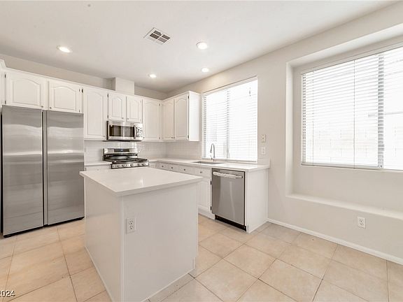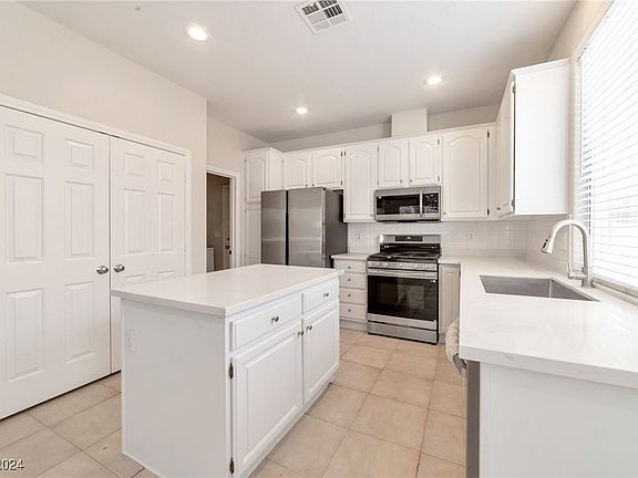 Look no further! This inviting 4-bedroom, 3 bath home w/ a 3 car garage is located on a cul-de-sac in the heart of Summerlin and zoned for the highly desirable Palo Verde S.D. The Kitchen cabinets have been professionally refinished. 4 new stainless steel appliances and new Quartz countertops, full size double door pantry, tile floors, backsplash. Living/family room w/ surround sound, 3-sided fireplace, large windows overlooking a finished backyard. Oversized primary bedroom w/ walk-in closets and fantastic primary bathroom. Brand new carpeting thru out home, tile in the wet areas! The private backyard features a patio deck, mature landscaping, fruit trees, rose bushes and side gate. Fantastic finished 3 car garage w/ 2 garage door openers. This is the only listing for sale at this time with a 5 min. walk to great schools, community center w/ pool and activities! Just minutes from some of the best shopping, restaurants in Las Vegas. Guest bath w/ dual sinks, solid countertop.