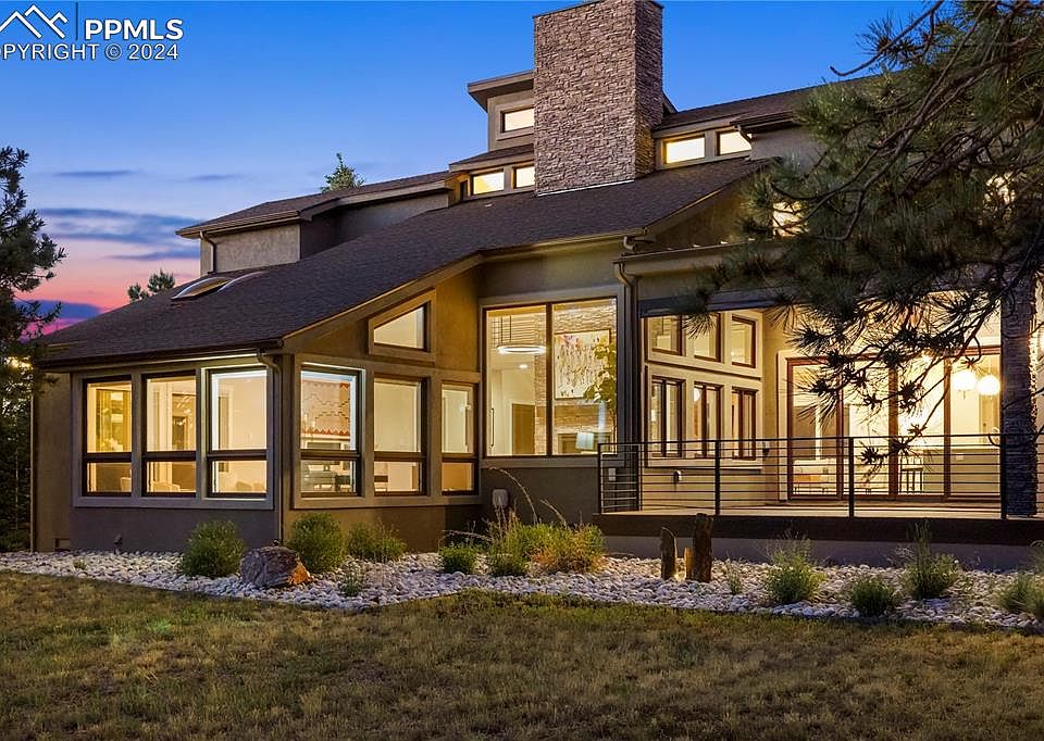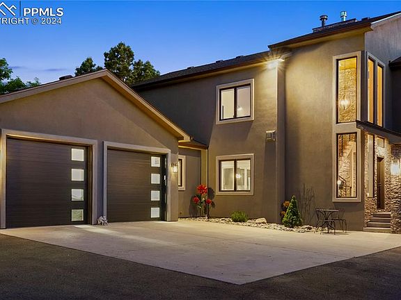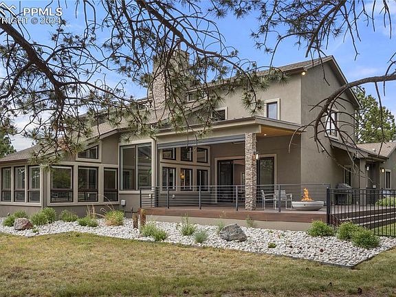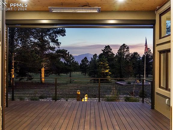 This home lives and feels as if you stepped into an Architectural Digest - it is absolutely stunning and there is nothing else like this available. The property is situated in very desirable southwest Black Forest on 9 acres that is perfectly treed w/ lush meadows and a great mixture of ponderosa pines, blue spruce, oak and fir trees. The acreage is subdividable w/ El Paso County approval so there is great future value available. Unimpeded views of Pikes Peak. The entire 9 acres is fenced, features an asphalt driveway to the home and 25x40 outbuilding, the front is secured w/ an electric gate and camera system. The home and additional detached garage have been renovated from top to bottom. Upon entering the home you are greeted with towering tongue and grove wood ceilings, large windows with loads of natural light, high end lighting, expansive rooms, neutral colors, wide plank white oak floors and custom metal railings. The kitchen is perfectly positioned for entertaining between the family room and the deck which is accessed through a large double sliding glass door. The kitchen has an abundance of cabinetry, Quartz counters, coffee station w/ pot filler, island, warming drawer, 6 burner gas cook-top, double oven, commercial vent hood. Great room w/ two story stacked stone fireplace. The family room features built-ins which match the kitchen cabinetry, a 6ft gas fireplace w/ wood statement wall. Expansive composite deck w/ metal railings, two heaters, motorized shade, gas grill and gas firepit w/ a metal fenced yard. Main level primary suite w/ two walk-in closets, built-in wardrobe, double vanity, heated floors, over-sized shower. Walk-out finished lower level with heated floors. Three upper level spacious bedrooms and a bath. The garage features 4 overhead doors which allow drive through, spray foam insulation, a radiant in-floor heat system that tackles snowmelt on the exterior concrete areas of the outbuilding. Virtual tour and marketing video available.