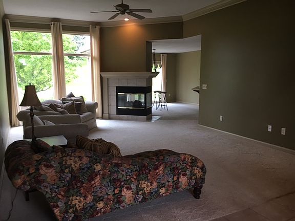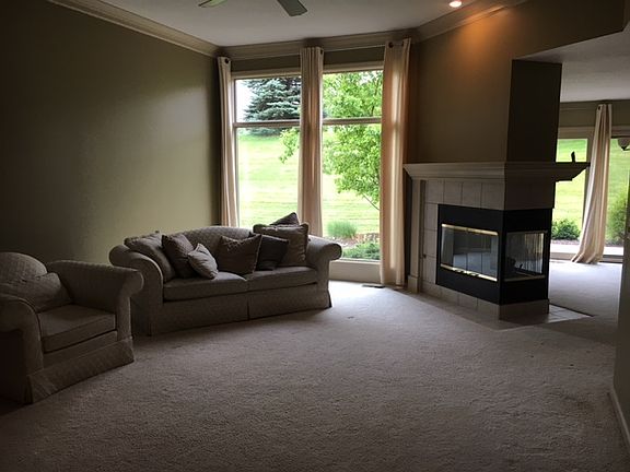 Cedar trimmed covered front porch, ceramic foyer entrance, painted woodwork, crown molding in south-facing great room with ten-foot ceiling. Three-sided fireplace in great room/dining/kitchen. Split bedroom floor plan. Trey ceiling master bedroom suite with walk-in closet, double vanity, garden tub with ceramic wall trim, block glass window, shower. Cathedral ceiling in bedroom #2. Open kitchen/dining lay-out, Harlan cabinets throughout. Ceramic kitchen floor, carpeted great room, dining room, and bedrooms. Kitchen appliances and all window coverings stay. Laundry room with utility sink. Water softener, insulated, large 2-car garage with bump-outs, service door with concrete stoop and walkway to back patio. Flooring in attic for additional storage. Lawn irrigation system paid for and maintained by association. Dues cover lawn mowing, landscape maintenance, snow removal, exterior paint, trash pick-up.