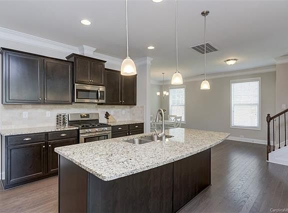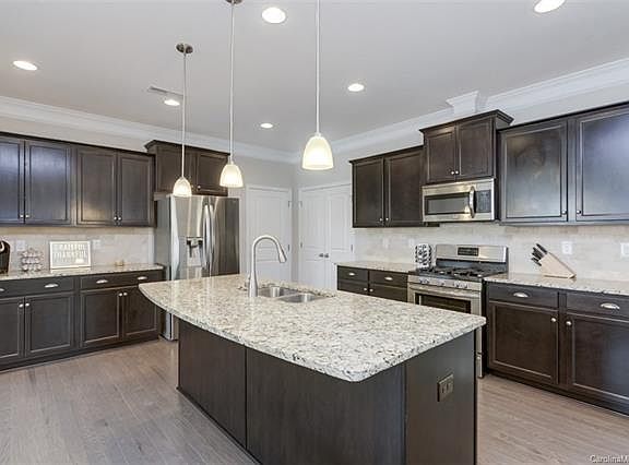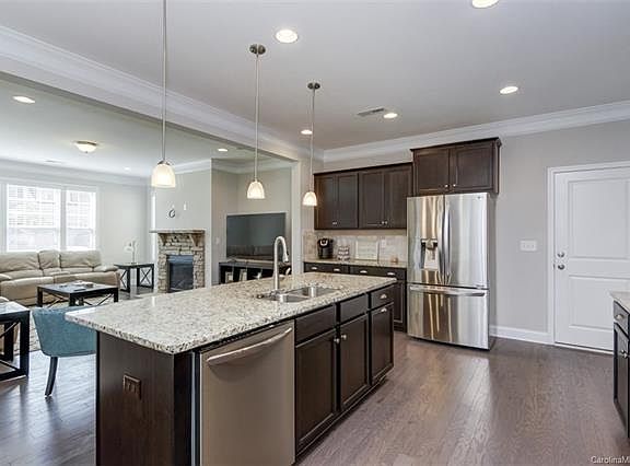Almost brand new home ready for relaxing on front or covered back patio. Beautiful open floor plan with prefinished wood flooring on main. Chef style kitchen with large island overlooking family room, ss appliances, gas range, built-in microwave and dining area. The family room is warm and inviting featuring stone surround fireplace. Master suite is on the main floor and features tray ceiling. The deluxe bath has dual sinks, separate shower and garden tub. Upstairs you'll find 3 large secondary bedrooms. Enjoy the peaceful back yard under the covered porch. Great neighborhood, with pool, playground and recreation area all close to shopping, restaurants and easy access to I-77.