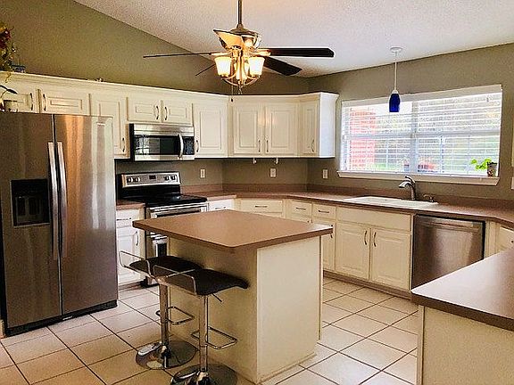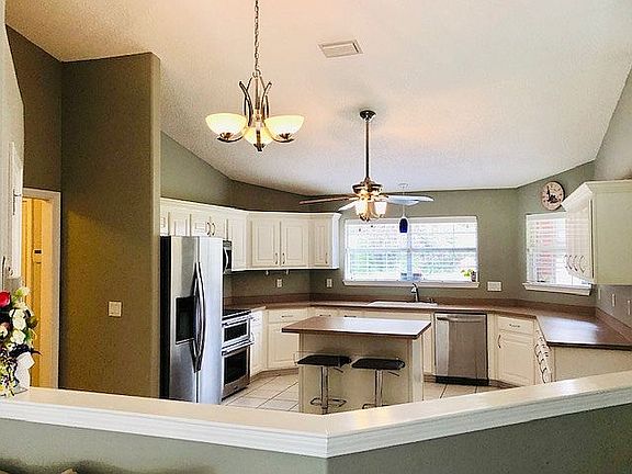 The nice layout of this 1,926 sq ft home feels both spacious and cozy. The roof was installed In Feb 2019 using heavyweight, dual layered shingles w/roof ventilation, insulation-lowering bills- barrier against leaks & protection from elements. HVAC (heatpump) installed 2024. Water access less than 5 min away. You can sit back & relax on screened porch overlooking the park-style landscaping & palm trees that are watered by the sprinkler system on well. More privacy than most houses in subdivision because of privacy fences and woodland area behind home, plus the cul-de-sac location means even more privacy. BBQ area for your grill! Storage building for lawn and garden equipment. Located in X- Flood Zone - flood ins. is NOT required! 3 BR plus BONUS RM that can be a dining room, office or a sunroom. Large kitchen with custom built dining table! There is even an island that has a breakfast bar. The kitchen is completely open to living area. The home has not only an open floor plan but, also has a split bedroom plan. Hardwood floors in LVG rm & recently installed plank tile in bonus rm. All wet areas have tile & laminate flooring in bedrooms make for easy cleaning. Living rm has fireplace w/ natural light coming through the sliding glass doors. Vaulted ceilings make the living area feel even larger! All BR's closets have custom built-in shelving for great organization! Master BR is extremely spacious! Large enough for king bed, desk/office area & even couple of chests. You also have 2 walk-in closets. The bedroom can be closed off to bathroom by using the pocket door. There are 2 separate vanities, a shower w/ seat, jetted tub & linen closet. 2 BRs are very spacious. Also a linen closet for the 2nd BA. The laundry rm directly off kitchen has extra shelving & cabinets w/ counter space. Protect your vehicles in the 2-car garage.