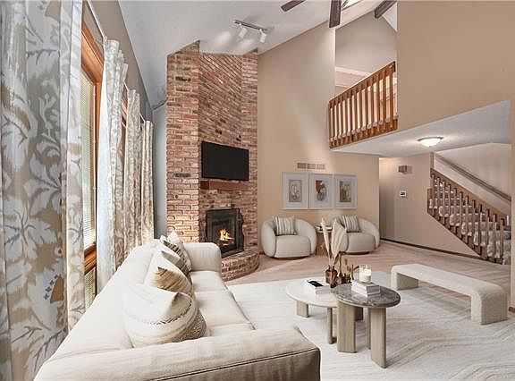 Amazing 1.5 story, 3 bedroom, 2 full bath townhome in Overland Park, Kansas. Nestled in the Indian Creek Park Estates subdivision. The home has a grand floor to ceiling fireplace as the focal point of the large living room. The kitchen features granite counters, tile floors, tiled backsplash and white painted cabinets. The primary bedroom is on the main level. Walk up the designer stair carpet to the second floor. Here you’ll find two bedrooms and a full bath, attic storage and a balcony that overlooks the living room below. The basement boasts a large unfinished area with endless possibilities. Out the backdoor is your own fenced in patio area. The home is a short walk to Cross Creek Park which has amenities such as a playground, picnic tables, and trails. The HOA dues include yard mowing, snow removal and trash service. All within the Blue Valley School District. Property must be owner-occupied.