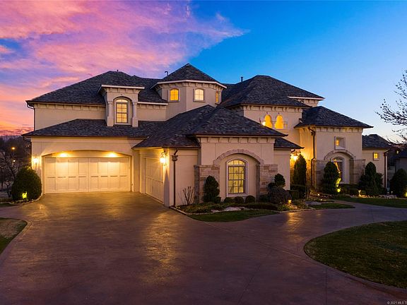Located in Gated Brook at Stone Bluff in the award winning Jenks school district. This stunning custom Mike Harrison built home sits on more than a half acre lot and offers a stone and stucco exterior. Well laid out 6,734 SF of living space includes five bedrooms, five full baths, one half-bath and four living areas. Exquisite details entire home hand-crafted trim, sculpted ceiling, Hardwood floors, spiral stairs, open beams and decorative lighting. Open plan has kitchen, breakfast room and vaulted family room. Massive stone fireplace in the family room. First floor office. Game room with wet bar and private balcony plus full theater room upstairs. Master suite is expansive with spa like bath, double closets, and bonus room (currently used as an exercise space). Outside oasis offers covered living areas with outdoor kitchen, stone wood burning fireplace, flagstone covered patio, in-ground, salt-water pool and putting green! Backyard offers extreme privacy as home backs to pond/greenbelt area.