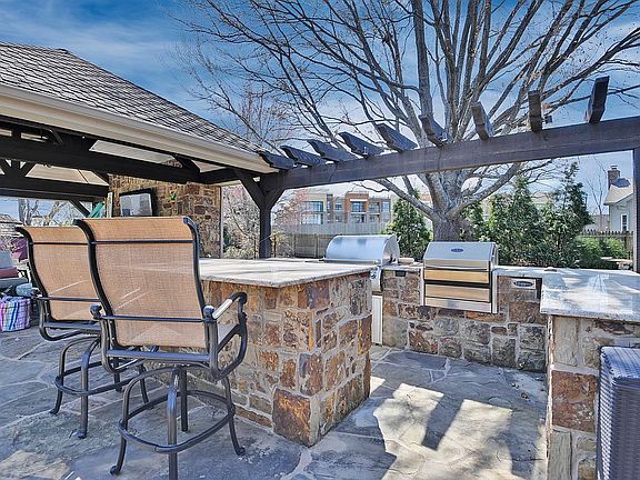 Resort Living in the heart of Overland Park! Coveted Grand Oaks Subdivision, Fabulous professionally remodeled 1-1/2 story on just shy of 3/4 acre lot. This 5 bedroom, 5-1/2 bathroom home offers his and hers master baths and separate walk in closets. Natural stone throughout this home inside and out from the Natural Stone fireplace and columns to the natural travertine stone tile on the main level combined with wide plank walnut hardwood flooring. Main level has 3 bedrooms and 3-1/2 baths, Gorgeous kitchen with custom cabinets, vaulted ceilings and new stainless steel appliances. Open Floor plan with open staircase to the completely custom finished lower level with egress. Lower level offers media room with all wiring and in-ceiling / wall speakers, bar area with sink, kids play and rec area along with main entertaining area and full bath and 5th bedroom. Resort style continues to the backyard with custom salt water pool and natural boulder waterfall, sunken firepit, full covered cabana with outdoor fireplace and TV area, 2 built in grills and bar area perfect for entertaining. Large backyard also features sports pad with in ground basketball goal and plenty of room for all your gatherings and activities. 3rd car garage is detached and offers its own HVAC. Buyers agents are welcome. Seller is being represented by licensed agent/broker.