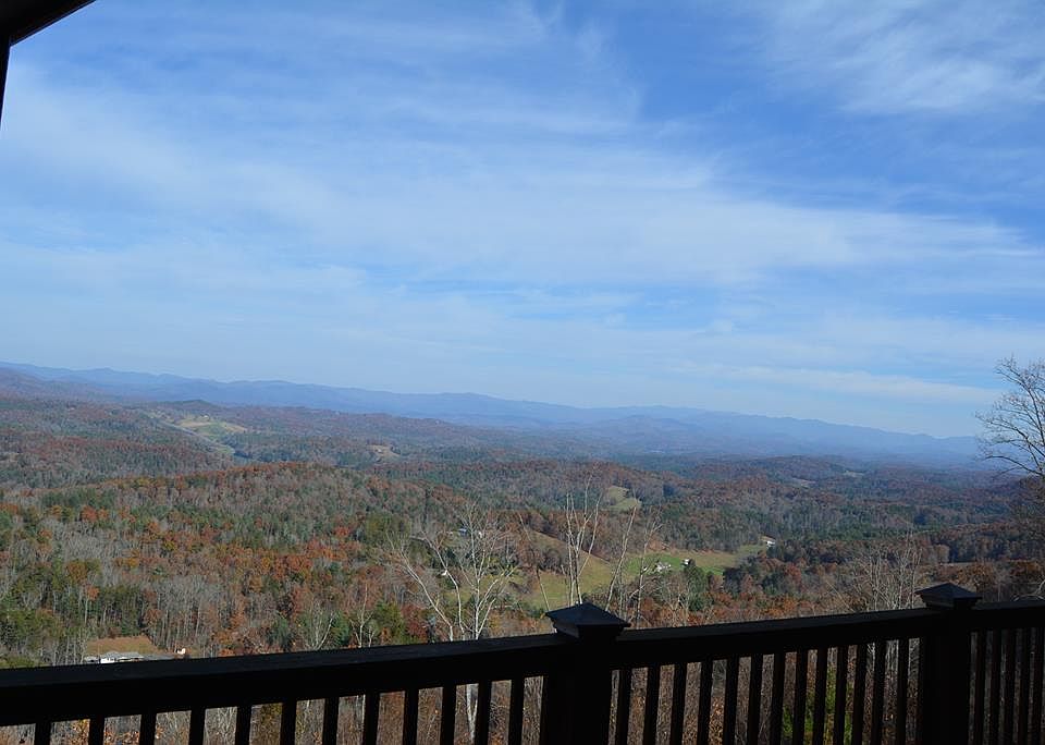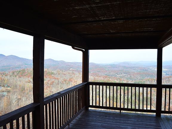 Mountain Top Chalet featuring A Million Dollar view from the living room and covered porches. Interior is roomy and in excellent condition featuring hardwood floors and TWO beautiful fireplaces. One Gas log and one wood burning.The Master bedroom is private and spacious. Oak custom cabinets plus a island in the kitchen. Natural tongue and groove pine ceilings with Ceiling fans through out. The basement is finished with a wet bar and a fireplace. Also a Full bath and a spare room with a bed. There is a large garage for a workshop or storage of your big boy toys. Paved access for you motorcycle enthusiasts. A must see if you are coming to the mountains for the views.
