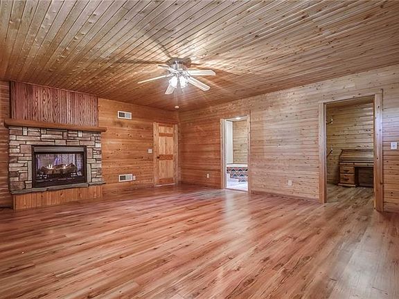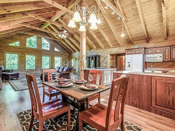 ONE OF A KIND HOME PRIVATE SETTING! OPEN FLOOR PLAN WITH SOARING CEILING! This grand space houses a great room with stone fireplace, a wall of windows, and a massive hickory tree support that provides an amazing focal point. The space also provides a flexible dining area along with an island kitchen w/breakfast bar and patio doors to the 20' covered porch. The owner's suite has a private master bath, jetted tub for 2, separate shower & double vanity. The suite also has a stone fireplace, deck + walk-in closet. There's 2 additional bedrooms w/shared bath can also divide into 1st floor powder room. Don't miss the 1st floor laundry/mud room. Walkout lower level makes a great guest suite or game room where there's a kitchenette, a bedroom area, a full bath plus wide open space and a bonus storage room. Spacious garage w/room for workshop. Level entry to both floors! Over 35' of deck space plus 20' covered porch. Privacy plus the convenience of 1 level living! Enjoy a get-away every day!