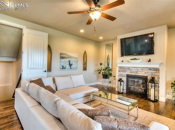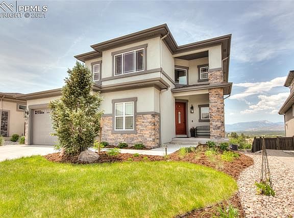 This stunning house will leave you speechless! Walk in and be wowed by this immaculate 4-bedroom, 4-bathroom home in the highly desired community, The Farm. The open floorplan is an entertainers dream which also features an extended covered deck off the kitchen for those spectacular views of the prestigious Air Force Academy and the Colorado mountainside. This house's main level is lined with beautiful flooring in the living room and the kitchen with upgraded countertops. Upstairs features a loft that can be a play area for the kids or an office space to get work done. The master bedroom is spacious with a large five-piece bathroom including a soaker tub, dual vanity, and luxurious walk-in shower. The lower level offers a fully finished walk-out basement that includes a bedroom and bathroom. The backyard creates a private oasis with designer landscaping and upgraded lighting that is setup for private WIFI irrigation system and plenty of space for entertaining family and friends. This highly desired community features multiple trails, park, and a community clubhouse.