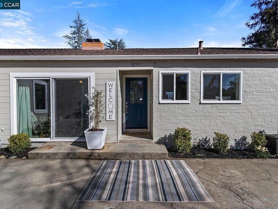 This adorable, quaint farmhouse in Lafayette is filled with character and charm galore! Lots of light, bright and airy with an open feel makes for an appealing and unexpected feel that the most discriminating buvers will love to call home. Exceptional location, walk to Bart and downtown Lafayette. Tucked away, at the end of a long driveway, on a special .36 acre lot with views of Mt Diablo and surrounding hills, this home is filled with history and amazing updates blending the old world charm of adobe bricks with modern conveniences. The heart of this incredibly charming three bedroom home is the great room featuring a large living room-dining area with fireplace and beautifully remodeled kitchen outfitted with granite countertops, breakfast bar, gas range, stainless steel appliances, and newer cabinetry. The high volume, open beam wood ceilings and expansive windows flood this great room with natural light while overlooking the backyard and covered porch. Casual, yet cozy, the spacious dining area is ideal for groups and everyday dining. Newer carpets, new paint, and dual pane windows complement the 3 bedrooms. Besides the 3 bedrooms there is an office/study/den with sliding door to the outdoors. Lots of storage, big 2 car garage, back porch, planters, + amazing Mt Diablo views