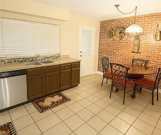 Modern backsplashPrivate fenced backyardUpdated kitchenAmple cabinet spaceTile floorsLarge closetsCozy brick-accent dining area