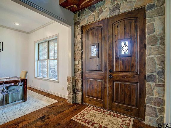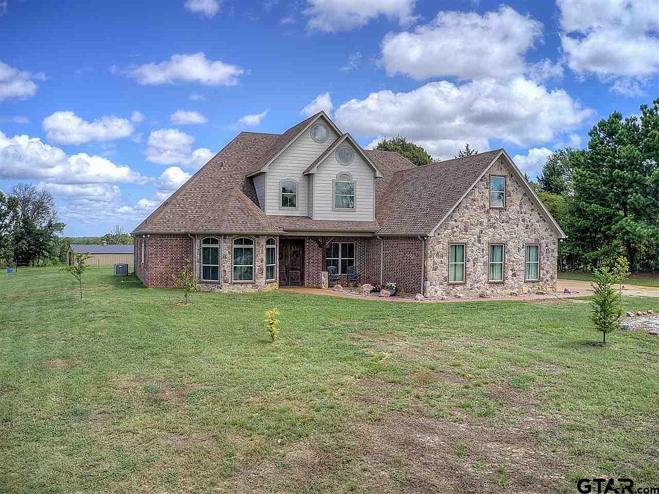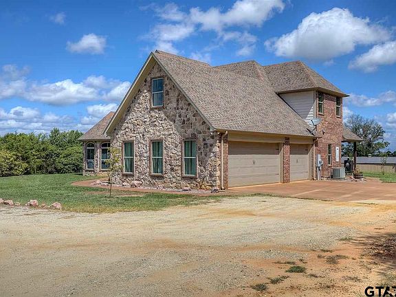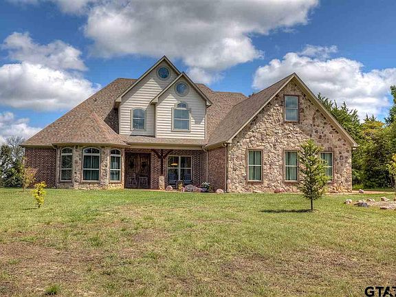 This beautiful custom home on over 24 acres features 4 bedrooms, 4 baths, 2 living areas, formal dining room, 3 car oversized garage, large outdoor entertaining area and so much more. The living room has a 22 ft stone fireplace, tall ceilings, wood floors, rock accents and flows easily into both the kitchen and outdoor entertaining area. The kitchen has granite countertops, island, stainless appliances, rock accents, and a large breakfast area with an abundance of natural light. Master bedroom and one additional bedroom are downstairs with two additional bedrooms upstairs. Master suite has wood floors, tall ceilings and nice ensuite bathroom with separate shower and corner tub. In addition to the two guest rooms upstairs there is one bath and large gameroom/living room. The many upgrades in the home include solid core doors, travertine floors and showers in the bathrooms and wood floors. Outside enjoy the beautiful views on the large back patio with outdoor kitchen, fireplace, full bathroom and the smaller patio just off the breakfast area. Outdoor kitchen area is equipped with sink, grill, ice maker and mini fridge. The acreage is just as fabulous as the house and includes a 33 x 40 metal barn with 3 custom horse stalls, open pasture as well as plenty of wooded areas, a pond, workings pens and more. Private drive has gate at the road for extra privacy. This property offers the very best of country living, access to all the amenities of Tyler as well as I-20.