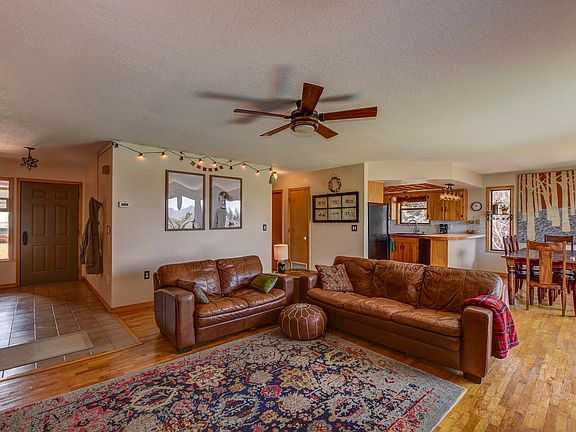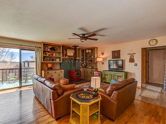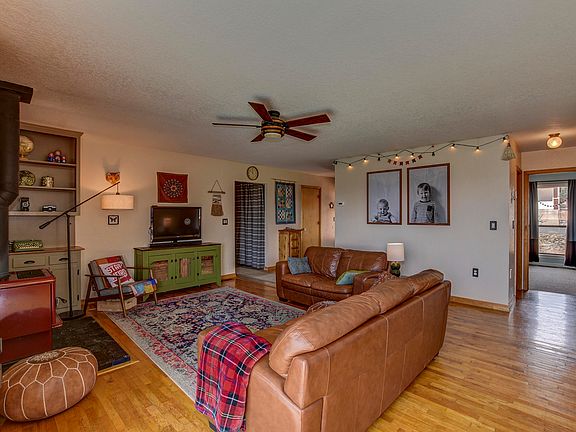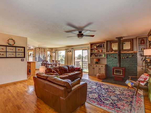 Cozy comfort watching woodstove flames flicker on chilly winter nights. Fruit trees bring brilliant spring flowers, followed by summer apricots, peaches and plums. Baking pies from the apple tree in autumn warms custom-built hickory kitchen cabinets looking great with tiffany-style lighting and nice black appliances (includes induction cook top, wall oven, microwave, dishwasher and matching refrigerator). Oak floors and built-in shelving in the open-concept living area complement the kitchen's look. Year round mountain views and sunrises entice you from multilevel entertaining decks, with sliders accessing both the living room and master bedroom. Large fenced yard includes horseshoe pits, expanded shed and 4 raised vegetable gardens. More than a house for sale, a home looking for a loving family!
