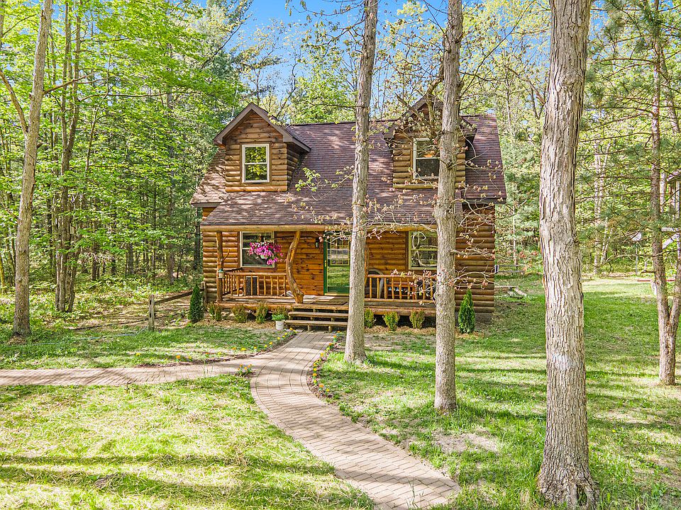 Charming 1600 sq.ft. Custom log home nestled amongst 20 acres of pines & hardwoods. Open floor plan with vaulted ceilings, oak spiral staircaise, loft bedroom and newly updated kitchen immediately shows off the home's character. Additional loft space in second BR which can be used for office, craft room or play space. Finished walkout basement with egress windows is perfect for rec. area or bedroom. Covered front porch and rear patio are perfect for relaxing and taking in nature as well as entertaining. One car heated garage + workshop, Fire pit, Tree house, sandbox, chicken coup and garden area. Hundreds of acres of state land near by and conveniently located between Manistee and Ludington. Dreaming of a move in ready home with plenty of space, acreage and privacy, this one's for you!Home features: under floor hydronic heat. West living room radiant wall heat; pellet stove living room, wood stove lower level Kitchen remodel 2021, under cabinet motion activated LED lighting, Jenn Aire, Fisher-Paykel appliances, bath remodel 2020, Garage insulated and heated, Lochinvar Boiler. Wood shed for outdoor boiler-underground lines and power run to house. (never used)