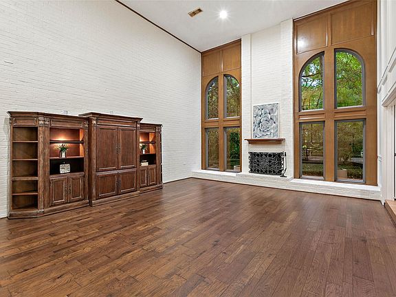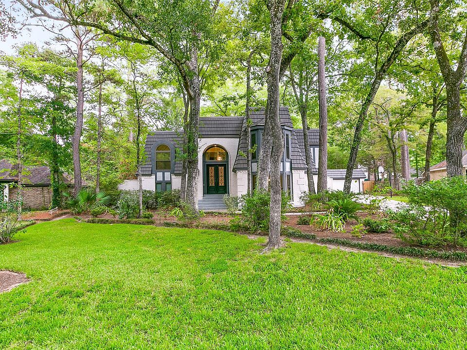 Unique updated French style home in the heart of The Woodlands. Exquisite finishes and architectural details throughout with beautiful double iron front doors. The raised grand entry descends to the family room, featuring a spectacular fireplace which extends to the ceiling, surrounded by tall, elegant arched windows. Updates include double pane energy efficient Anderson windows throughout, gorgeous updated hardwood floors, new carpet and a huge workshop w/ A/C. The lifetime Mansard roof shakes, metal stair balusters, stainless steel appliances, custom cabinets and granite kitchen and bath countertops are a few of the upgrades. Game room could also be 2nd primary bedroom. The remodeled primary bath has a huge walk-in shower, custom cabinets with quartz countertops, and new fixtures, toilet & lighting. The downstairs primary bedroom, with it's own cozy fireplace, has a gorgeous view of the huge, picturesque backyard oasis with multi-level decking for relaxing under the canopy of trees.