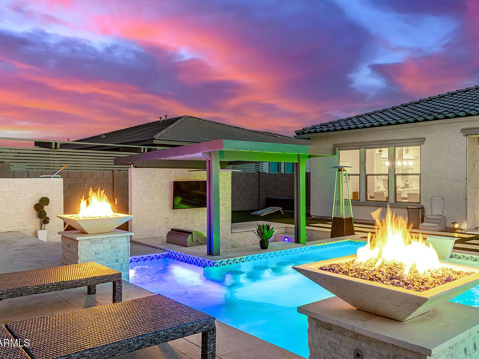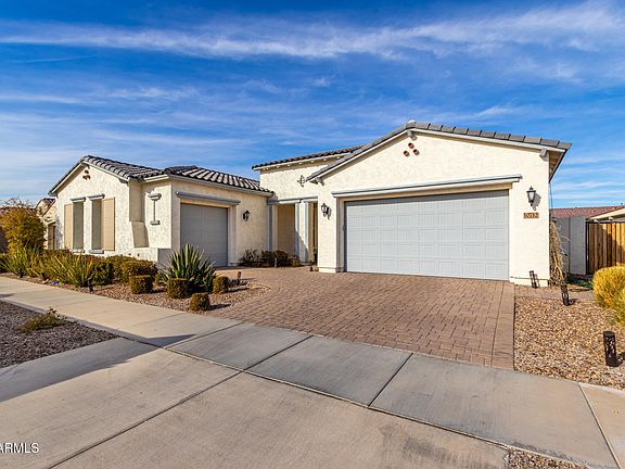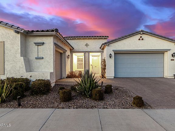 What a RARE find! This stunning 4-bed, 4.5-bath home in the gated Estates at Eastmark has all the bells & whistles. Staring with a well-manicured landscape, a split 3-car garage, and a paver driveway. The home exudes elegance with high ceilings, a neutral palette, abundant natural light, stylish light fixtures, wood-look tile flooring in common areas, and soft carpet in bedrooms. Formal dining room! The open-concept living room is paired with surround sound, a cozy fireplace, and multi-panel corner sliding doors for a seamless indoor-outdoor transition. The gourmet kitchen is a chef's dream! It showcases high-end SS appliances w/cooktop gas, a plethora of cabinetry, a walk-in pantry, sleek quartz counters, and a huge island w/breakfast bar. The versatile den can be an office or game area. The large owner's suite has outdoor access and a lavish bathroom with a soaking tub, a tiled shower, a make-up vanity, dual sinks, & a walk-in closet. Each secondary bedroom is also equipped with its own walk-in closet & private bathroom. But the true highlight is the RESORT-STYLE backyard, presenting the ultimate in relaxation and entertainment! A covered patio, well-laid travertine, artificial turf, a putting green, and a sunken BBQ grilling station create an integrated and contemporary outdoor experience. The centerpiece is a luxurious swimming pool & spa with vibrant LED lighting that enhances its modern design, complemented by a basketball hoop, shallow area, & fire features. The Estates at Eastmark provides an exceptional living experience with its extensive amenities! That includes a private clubhouse, sparkling pool, fitness center, parks, trails, and sports courts, offering a perfect mix of relaxation and recreation in a vibrant community. Words can't describe this property. See it! Love it! Live it!