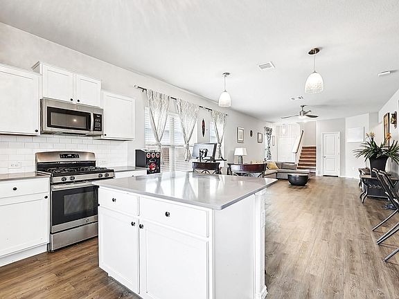 - Ceiling Fan(s), Double Vanity, Eat-in Kitchen, Kitchen Island, Multiple Dining Areas, Open Floorplan, Pantry, Primary Bedroom on Main, Quartz Counters, Recessed Lighting, Soaking Tub, Walk-In Closet(s)