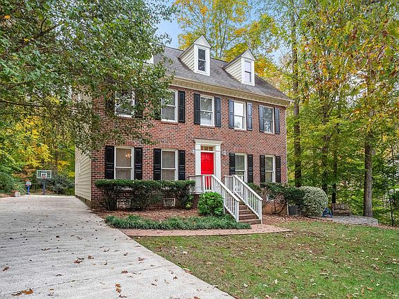 Situated on a nearly one acre wooded lot, this gorgeous N. Raleigh home provides privacy & serenity. Major updates, including whole-house repipe (NO POLY), newer HVACs, incl. 3rd floor mini-split AC unit & both full BATHs nicely updated. Home is freshly painted throughout, including white KITCH cabinets, which dramatically brightened this room. Other areas on main level include BRKFST AREA in KITCH, FRML DIN RM, LIVING RM (set up as an OFC), huge MUD RM w/ brick flooring & built-in shelving & FAM RM w/ new carpeting & masonry FRPLC flanked by built-in white bookcases. Second floor houses the home's sleeping quarters + sep. LAUNDRY RM & large BONUS RM. The primary BDRM has a spa-like ensuite BATH w/ an expansive glass encased tiled shower w/ dual shower heads. Third floor has an add'l BONUS/FLEX space, which could be utilized as BDRM, OFC or GYM. Home has two decks: small balcony deck just off BONUS RM w/ space for table & chairs & a much larger main level deck for great outdoor entertaining. Decks overlook backyard's wooded lot w/ fire pit & winding creek w/small garden bridge.