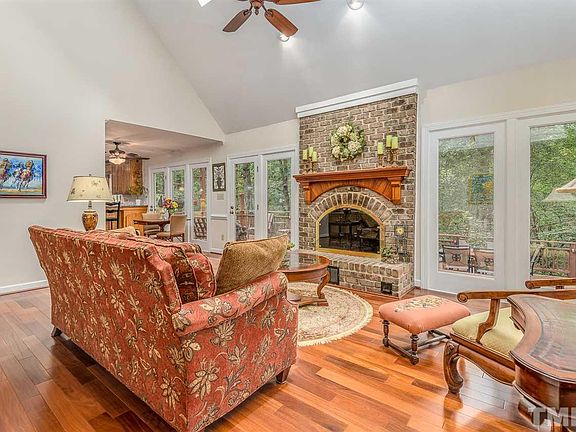 Lovely home with lots of privacy with 3+acres of hardwoods. Wall of windows. Master bath with custom walnut cabinets, custom mahogany mantle in living room, custom 1000+ square feet three level deck. Brazilian teak hardwood floors in living room, breakfast area, and kitchen. House painted 2017. New Heat Pump and duct work upstairs 2018 (10 yr warranty). Quiet neighborhood. Country feeling. Only minutes to shopping, movies, restaurants and Falls Lake. New refrigerator 2017. Home warranty for the buyer!