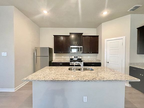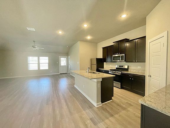 Built in 2020, this stunning single-story residence boasts 3 bedrooms, 2 bathrooms, and a versatile flex room. The well-designed open floor plan showcases vinyl wood laminate floors throughout, recessed lighting, a separate dining area, and a convenient laundry room. The kitchen is a highlight, featuring espresso cabinets, a pantry, an eat-in kitchen, and an island adorned with exquisite granite countertops.