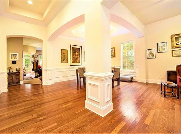 New Price! Enjoy all the Ballantyne Community has to offer in this lovely ranch in sought after Stone Creek Ranch. The covered entryway reveals stunning features like sweeping archways, tray ceilings and picture frame molding. The entry hall boasts an exotic mural and elegant pre-finished hardwoods grace the foyer, dining room and living area. The grand dining room is the perfect place to entertain. The architectural features are echoed in the generous family room. Sit back and enjoy your cozy gas log fireplace, play a board game or watch your favorite TV show with surround sound! The galley kitchen is partially open to the family room and has a wide arched pass-through. SS appliances including a double oven range. The breakfast area leads to a covered back patio. Master bath has a garden tub split vanities and a separate shower. The second bath has dual vanities too!. There is a privacy wall at the back of the property and...LAWN MAINTENANCE IS INCLUDED IN THE HOA DUES!!!