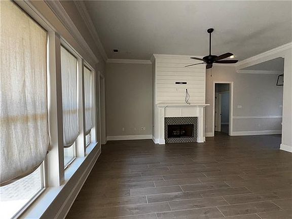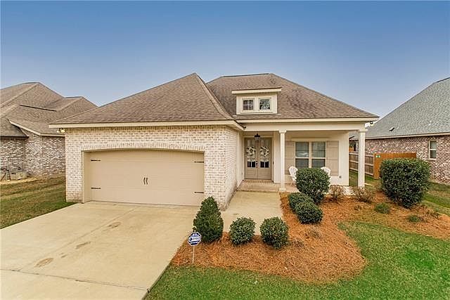 This beautiful 3-bedroom, 2-bath home, with a true office, offering modern elegance and charm in one of Madisonville's most sought-after neighborhoods, The Oaks of Guste Island. Start your mornings with a cup of coffee on the cozy front porch, then step inside to discover an inviting open floor plan designed for seamless living. The den flows effortlessly into the kitchen, great for entertaining. Over-sized den featuring a center wall gas fireplace with a ship-lap accent over the mantle, as well as gorgeous pediments over the windows in both the den and dining room. Wood tile flooring in all living areas and the office. Dimmer switches throughout the home, add that modern touch and will create any mood you're seeking. The spacious kitchen is a chef's dream, complete with stunning backsplash, a large island with ship-lap front, 3-cm granite counter-tops, stainless-steel appliances and a walk-in pantry. The generously sized, primary ensuite is a true retreat, boasting tray ceilings. The custom closet buildout will keep you so organized! Dual vanities with extra cabinet space, quartz counter-tops, a glass walk-in shower, and a soaking tub for unwinding after a long day. Step outside to your covered brick back patio, the perfect spot to enjoy spring and summer afternoons in your private outdoor space. Gas and TV outlets on the back patio for entertaining and setting up gas grills, etc. This gem is conveniently located within a family-oriented neighborhood with a Jr. Olympic size pool, clubhouse and soccer field; just mins from Hwy 22 and Madisonville Schools and the Tchefuncte River.
