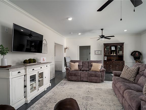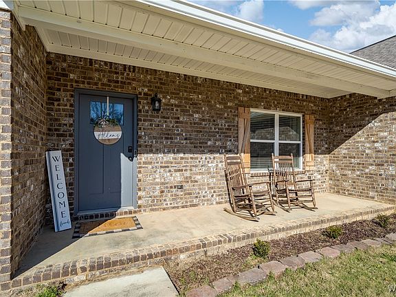 Embrace comfort and convenience in this charming home situated on a nearly ½ acre corner lot. The inviting front porch welcomes you into a thoughtfully designed split floorplan featuring durable gleaming stamped concrete floors throughout, ideal for easy cleaning and maintenance. The bright kitchen includes granite countertops, a convenient pantry, and a dedicated desk nook, while the spacious primary bedroom offers a walk-in closet and expanded bathroom double vanity. The extra large living room offers enough space to have one large central living set up, or a second sitting area. Step outside to the covered back patio, perfect for outdoor grilling and lounging. The fully fenced backyard provides ample space for outdoor games, or for the dog to run. Located seconds from Downtown Moundville and Big Mike's Steakhouse, this home offers the ideal blend of space and accessibility, with no active HOA.