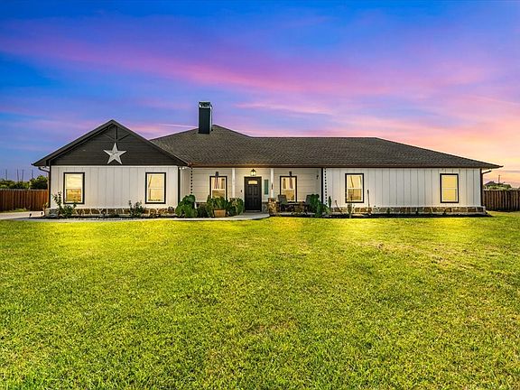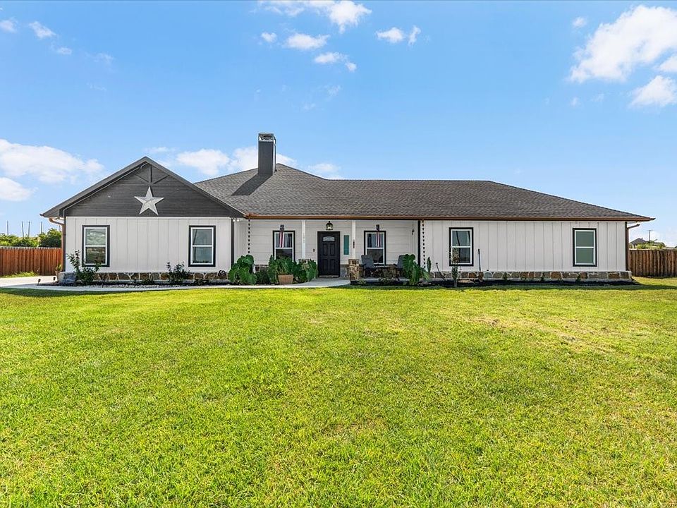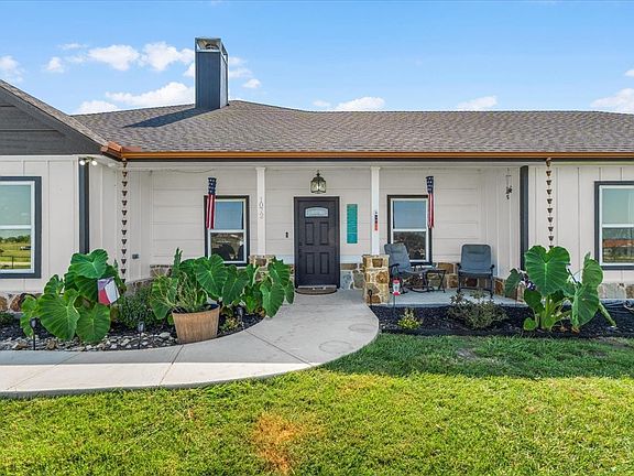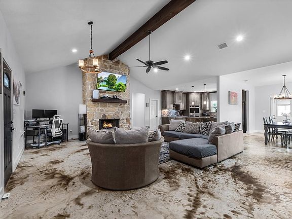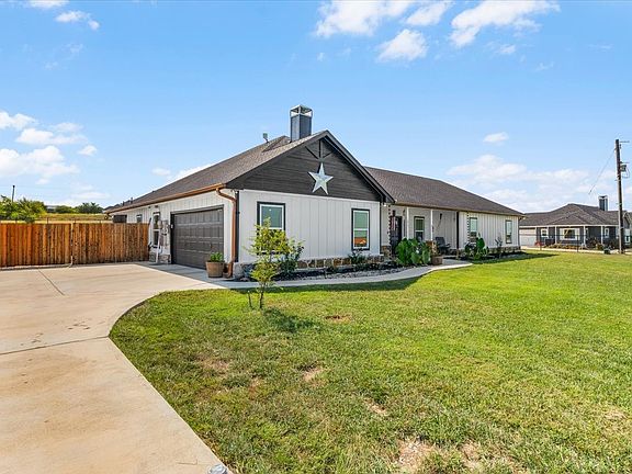 Discover this beautiful home combining country charm with modern comfort. the home offers a thoughtful layout with a split bedroom design for privacy and functionality. The main living areas feature sleek stained concrete floors. The open living space includes a striking floor-to-ceiling stone fireplace and flows seamlessly into the kitchen and dining areas. The kitchen boasts granite countertops, a breakfast bar, stainless steel appliances, a large pantry. The primary suite is a true retreat, with dual vanities, a garden tub, walk-in shower, and generous walk-in closet space. Each secondary bedroom has a ceiling fan for year-round comfort, and the large utility room offers a sink and space for a freezer. Enjoy outdoor living on the covered back patio, overlooking a private backyard complete with an above-ground pool. **Solar panels will be paid off and conveyed at closing, adding energy efficiency to this move-in-ready home** Perfect for entertaining, relaxing, and enjoying country living just minutes from town. *This home qualifies for the USDA program with ZERO down! ask me about our preferable lender.*