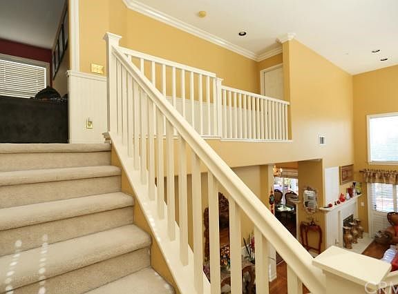 Located in the private gated community of Bella Vista on the Greens. This lovely home features 4 bedroom, 2.5 bath. Vaulted ceilings accent the many features that include, Pecan wood floors, plantation shutters, wainscoting/crown molding. Recessed lighting and plenty of windows gives the home a airy and open feeling. Great for entertaining, the formal living room and family room features a two sided fireplace and media niche. Dual sliders from the kitchen and living Room provides easy access for indoor/outdoor living. Enjoy the tranquil back yard setting with brick hardscape and covered patio includes a built-in gas tiled BBQ and relaxing in ground spa with waterfall. The 4th bedroom has been converted into a cozy media or upstairs family room. Attached there is a 2 car garage. Low Association fees that includes front yard landscaping maintenance, pool, spa, RV/ boat parking all in a private gated community.