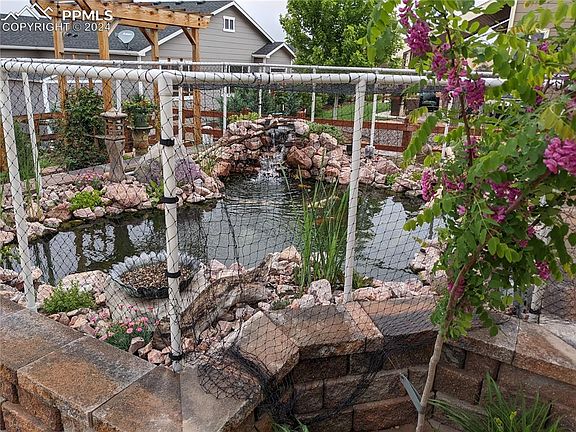 Welcome to your dream home – a stunning 3 bedroom, 3 bath ranch that effortlessly combines elegance, comfort, and a touch of nature's serenity. As you enter, the warmth of the beautiful hardwood floors in the main living area immediately captivates you. These floors, paired with the sophisticated alder doors and trim throughout the home, create an atmosphere of refined luxury. An open concept living, dining and kitchen area accentuated by a the warmth of a fireplace in the living area and is the center of the home. Step outside to discover the true gem of this property - a meticulously designed backyard. Here, a large, inviting patio offers a splendid view of the enchanting water feature, complete with graceful koi (optional to keep). This peaceful oasis is complemented by a large covered patio, elegant pavers, a redwood arbors nestled among climbing vines, roses, the majestic presence of a lotus tree, and sprinkler and drip systems throughout the landscape craft an idyllic low maintenance outdoor retreat. The water feature, enhances the experience, especially during nice weather when the soothing sounds of the water can be enjoyed from the bedroom window and living areas, promising tranquil mornings and peaceful nights. The netting can easily be removed and is in place to protect the koi, which can remain or be removed. The home also features a fully finished basement that extends your living space. It includes a large living area separate media room ideal for a home theater or a hobby space, alongside two additional bedrooms and a full bath. This property is more than just a house; it's a sanctuary where every detail is curated for comfort and luxury. From its thoughtful interior design to the blissful backyard haven, this home promises a lifestyle that balances indoor elegance with outdoor tranquility. Imagine all of this and quick access to I-25 making easy commutes to DTC, Denver, or CO Springs, close to amenities and the quaint downtown of Monument.