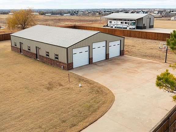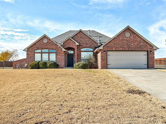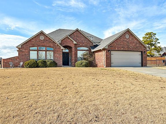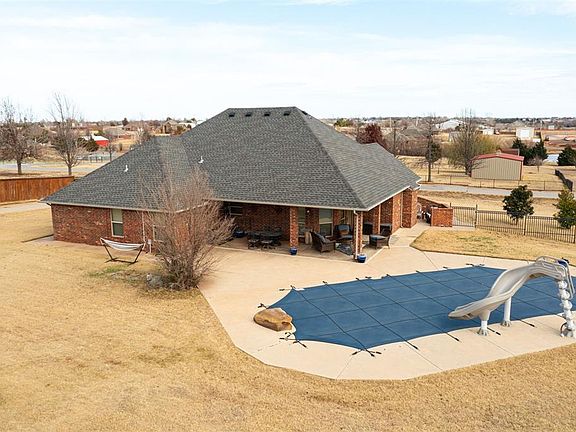This beauty in the heart of Bridge Creek/Blanchard is a 4 bed, 2 bath home. Peaceful living awaits on this 1 acre property complete with an in ground pool + slide, basketball goal, and 40x60 shop! The large shop is split in the middle and divides a game room space and a 3 car garage. Game room has a bathroom with vanity, toilet and a shower that has been plumbed in. Spacious living room adorned w/ a vaulted ceiling that is set off by the morning sunrise through beautiful arched windows. Living includes a brick fireplace and a beautiful custom mantle with matching builtins for storage. Carpets throughout have been professionally cleaned. The 4th bedroom has a closet and views of the front yard and can be used as an office space. Master suite includes lighted trayed ceiling, a jetted bath tub, a shower with dual heads and a walk in, wrap around closet with a built in hamper. Backyard also includes an easily accessible, 8 person storm shelter. Imagine summers here on the back patio watching the sunset or taking a dip in the pool. Bridge Creek Schools/Blanchard Address/Tuttle Newcastle area… Welcome to this Tri City home!