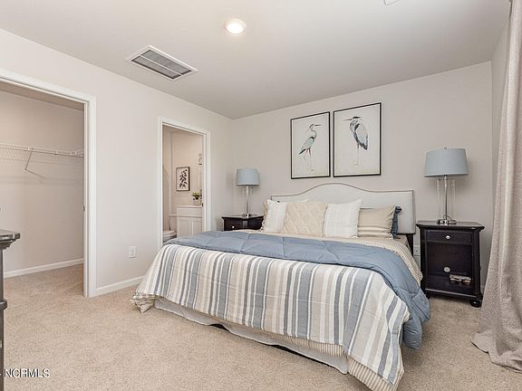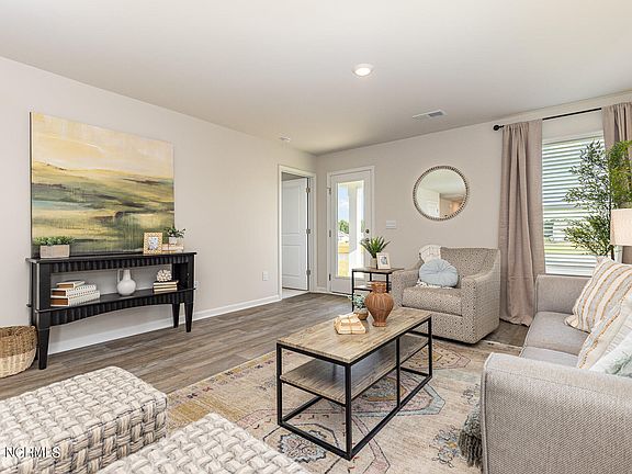 Welcome to Stanbury Creek, offering new homes with thoughtful details and smart designs plus a convenient location. The front porch and foyer welcome you in to this perfectly livable one level home with a beautiful open concept living area for entertaining. The kitchen features a large island, pantry and Whirlpool stainless appliances. The owner's suite is tucked away at the back of the home, separated from the other bedrooms, with a vanity and 5' walk-in shower. The patio off the living room extends your space outside to enjoy the coastal weather. This is America's Smart Home! Each of our homes comes with an industry leading smart home technology package that will allow you to control the thermostat, front door light and lock, and video doorbell from your smartphone or with voice commands to Alexa.