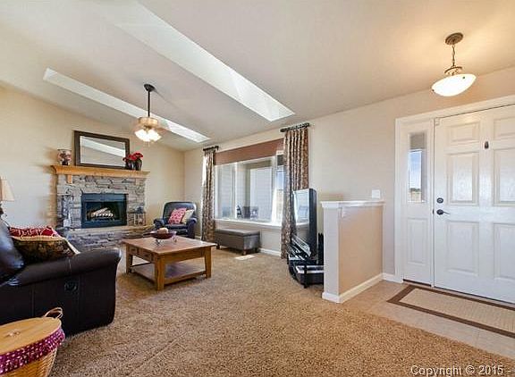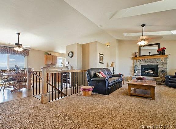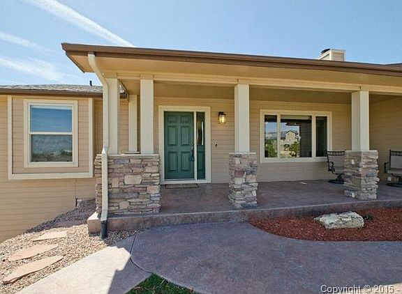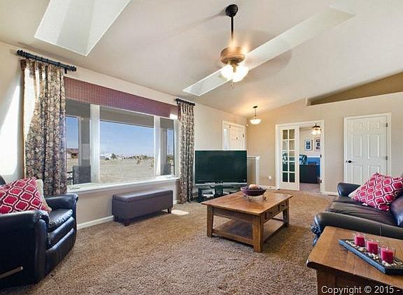 This great ranch home located on over 3 acres in Peyton has stunning views of the Front Range. As you enter the home you will notice the large living room with vaulted ceilings, functioning skylights and a wood fireplace. To the back of the house is the kitchen with dining area, tons of cabinet space, a large walk-in pantry and a walk-out to the back deck. To the left are two bedrooms and a full bathroom. In its own wing of the house is the master suite, with a walk-in closet, an attached master bath with a free-standing shower and soaking tub, and another walk out to the back deck. Downstairs the spacious family room has a bar area, stonework walls, and a gas fireplace connected to the thermostat . There are two additional bedrooms as well as another full bathroom. A huge detached garage measures 40 feet by 60 feet has 2 large bay doors, one large enough for an R/V or bus. Inside, the garage has radiant heat, has a overhead utility door, and was finished with plywood. The floor is 5 inches thick and is reinforced with fiberglass. The outside of the home has beautiful stone work and a newer roof. Enjoy mountain views from the back deck that spans the entire length of the house. The circle front driveway is detailed with stamped concrete and is also 5 inches thick and reinforced with fiberglass.