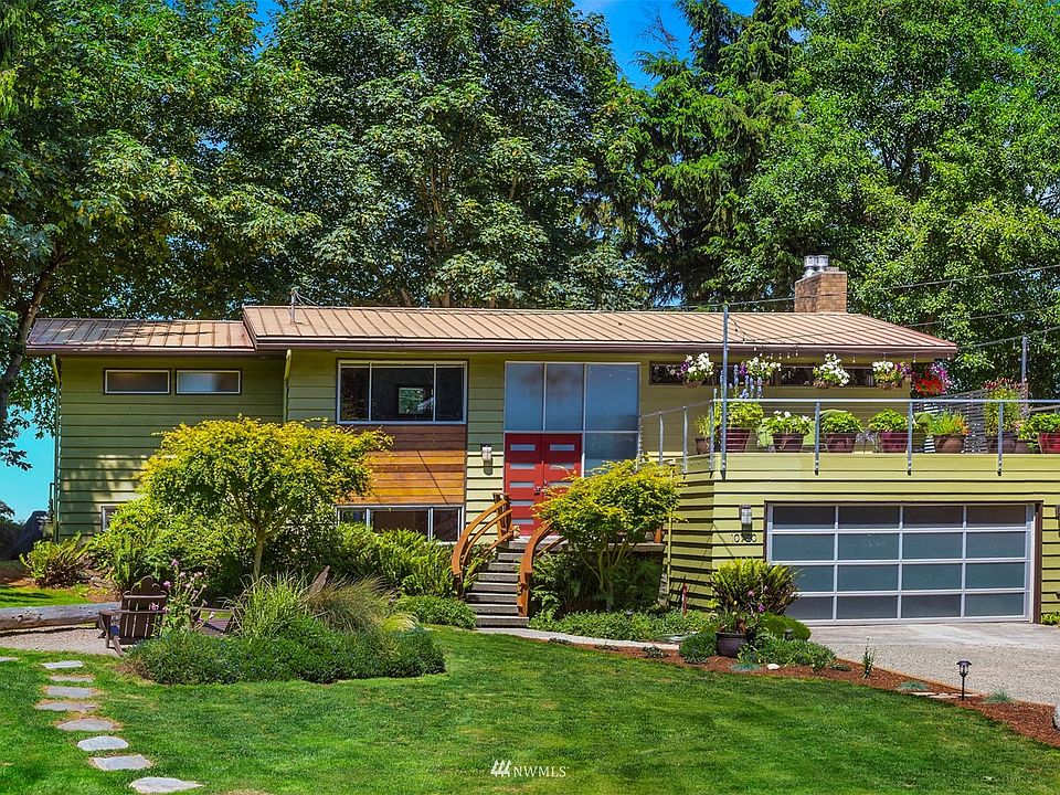 A rare opportunity to own a breath-taking panorama of Puget Sound, city lights, marine traffic, Mount Baker, and ferries! All from this beautiful, tastefully updated 3160 sq ft Mid-Century Modern home. Two levels, 3 bedrooms, including an ensuite master w/private access to spacious deck. 1 bonus room. 2.75 lovely, remodeled baths. Main level includes an open kitchen, voluminous living/dining area w/ stone fireplace and convenient deck access. Lower level has additional living area w/fireplace, office, and a walkout to a covered seating area that features a putting green. 2-car attached garage w/shop. Hot tub, RV parking with 30A power, ample interior/exterior storage. Community Beach Rights. A coveted location only 3 blocks from the ferry!