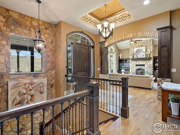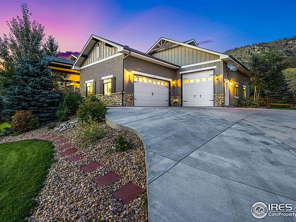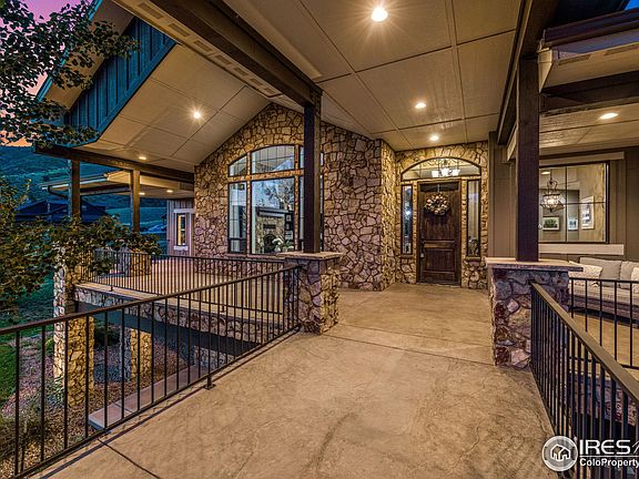 Enjoy stunning Rocky Mountain views and sunsets from this custom 4 bedroom, 5 bath home on private but convenient 3.31 acres located just 15-20 minutes west of Fort Collins. Buckhorn Ranch is a beautiful gated subdivision. Mature trees and rock outcroppings accent the picturesque setting of the home. Zoned Open and has paved roads. Elk, deer & other wildlife abound. Open, sunny floor plan with 360 views.The stunning main entrance is ensconced by a soaring covered balcony deck that welcomes you home. The kitchen is a chef's dream. Granite counters, built-in gas stove top and ovens. A custom range hood adds old world charm to the kitchen. There is an oversized island with a breakfast bar that works great for entertaining. The backyard covered patio is the perfect setting for evening barbecues. Warm wood floors and lovely archways accent the home. The living room has a wood burning fireplace with adjustable fan and remarkable views to the west. Enjoy the main floor primary suite with gas fireplace, soaking tub, walk-in shower, walk-in closet with built-ins and private access to covered balcony deck. Main floor laundry room has plenty of storage and utility sink. Professionally finished walk-out basement has 2 bedrooms, 3/4 bath, gas fireplace, wet bar with wine refrigerator, theatre room/study and a large storage room. Central Air. Heated 4 car attached garage has hot & cold water for your projects and a large bay for RV or boat storage. A heated, detached 1,176 sf 4 car shop/garage/flex space has 3/4 bath, is insulated, wired and drywalled and could easily be converted to an office space, toy storage or additional living quarters. Utilities are Poudre Valley REA Electric, Little Thompson Water, Propane, and septic system. HOA $1000./Year. 15-20 minutes to Fort Collins, Loveland, Horsetooth Reservoir, Lory State Park and other amenities. Attention to detail and quality construction is evident in this lovely home.