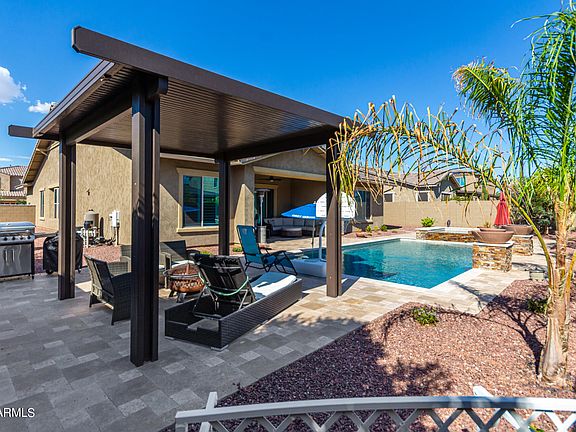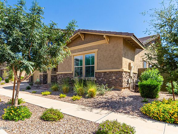 Wow, just wow!! This stunning 4 bed, 3 bath single level home with POOL in the desirable Eastmark community will leave you in awe! Charming curb appeal highlighted by a delightful front yard, stacked stone elevation & paver driveway/pathway. Discover a fabulous interior that ''shouts'' attention to detail throughout! You'll surely love the open layout paired with plantation shutters, neutral paint t/out, lovely lighting fixtures, wood-look tile floors in common areas, and carpet in bedrooms. The gourmet kitchen offers high-end SS appliances w/gas cooktop, wall ovens, quartz counters, staggered Gray Timberline cabinetry w/crown molding, a pantry and an island w/breakfast bar. Enter the Master bedroom to find a spotless en-suite with a garden tub, walk in shower w/rain showerhead and stone floors, split vanities, and a walk-in closet.