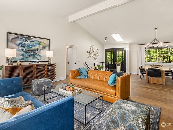 Nestled in mature landscaping, this fully updated 4-bed daylight rambler in Edmonds boasts an inviting contemporary style. Skylights & vaulted ceilings enhance spacious, light-filled interiors. Great room overlooks lush greenery. Chef's kitchen showcases Dacor & SubZero, dual-tone custom cabinetry, & quartz counters. 2nd living space w/ gas fireplace & French doors leading oversized deck, covered patio, firepit, & fully-fenced backyard w/ garden. Main-flr primary suite w/ oversized walk-in shower & dual vanities. Lower-level rec rm has 2nd gas fireplace. 2-car garage w/ additional gravel parking & dedicated mudroom/laundry + den. Updates include: engineered hardwoods, carpet, plumbing, baths, lighting, kitchen, & electrical panel.
