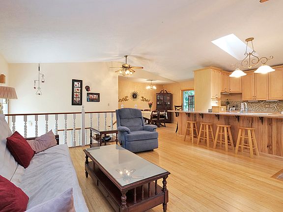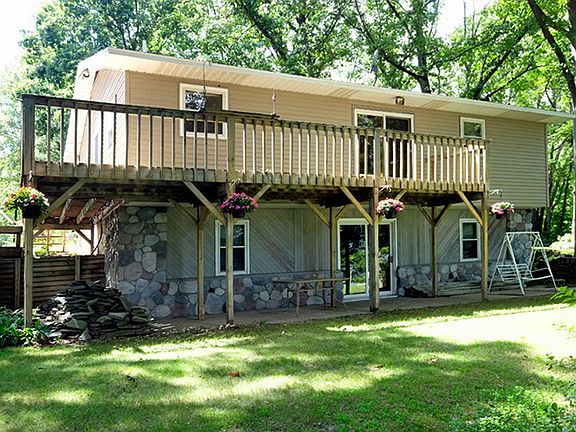1.39 Acres with 104 ft. of attractive lake frontage on Pine Lake #2, the largest of the 4 lakes. This walkout ranch-style, 3 bedroom, 2 bath home boasts 1740 sq. ft. of finished living space. Many updates throughout. Main floor features a spacious open concept kitchen meant for entertaining with ample maple cabinetry and large breakfast bar/serving area. Dining room has a lake view and walks out to the wraparound deck; the perfect place to relax and take in the spectacular view of the lake. Mast er suite is on the main level with huge master bath and walk-in closet. The lower level has 2 additional bedrooms, full bath, a storage/utility area and laundry room. Hardwood, tile and laminate flooring throughout. A floating t-shaped dock is included in the sale.